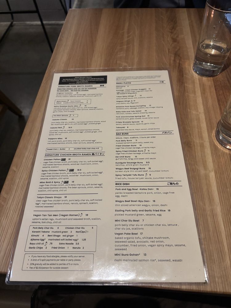 Cage-free chicken broth, egg noodle, Berkshire pork belly char siu, soft boiled cage-free egg, marinated bamboo shoots, kikurage mushroom, diced onion, scallions.