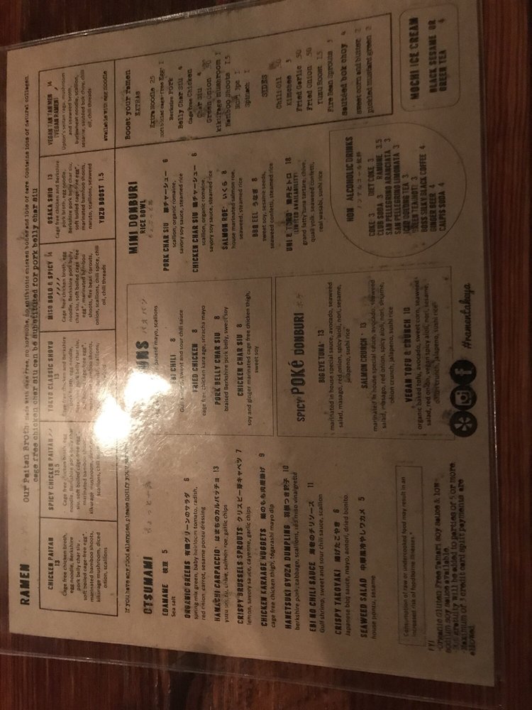Cage free chicken broth, egg noodle, Berkshire pork belly char siu, soft boiled cage-free egg, marinated bamboo shoots, kikurage mushroom, diced onion, scallions, chili spice. Spicy.